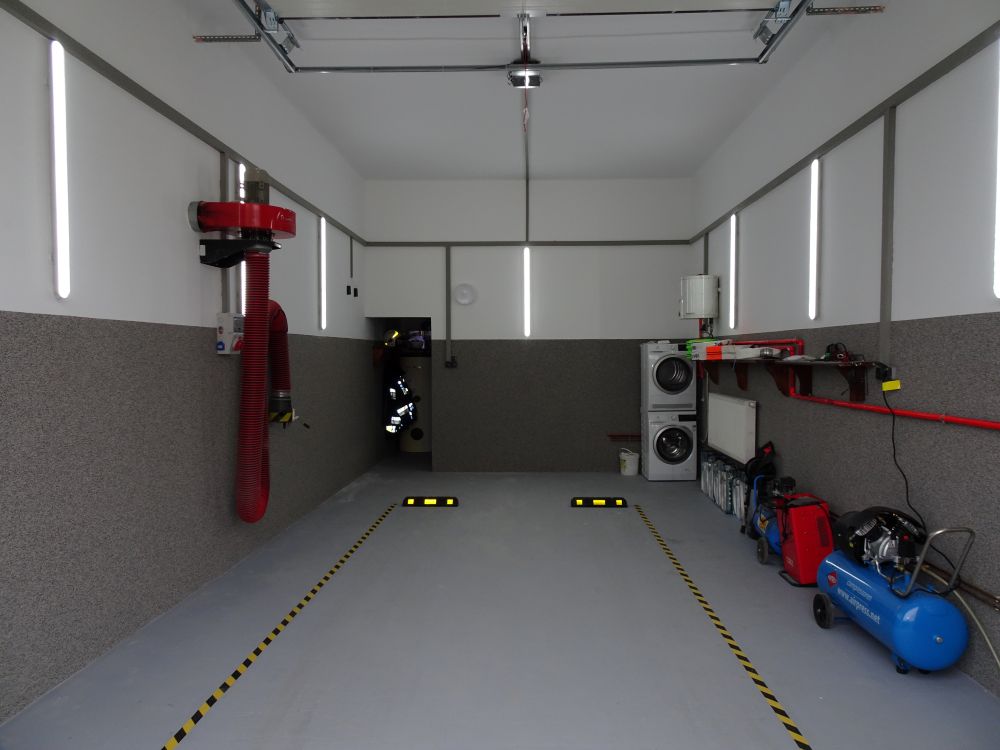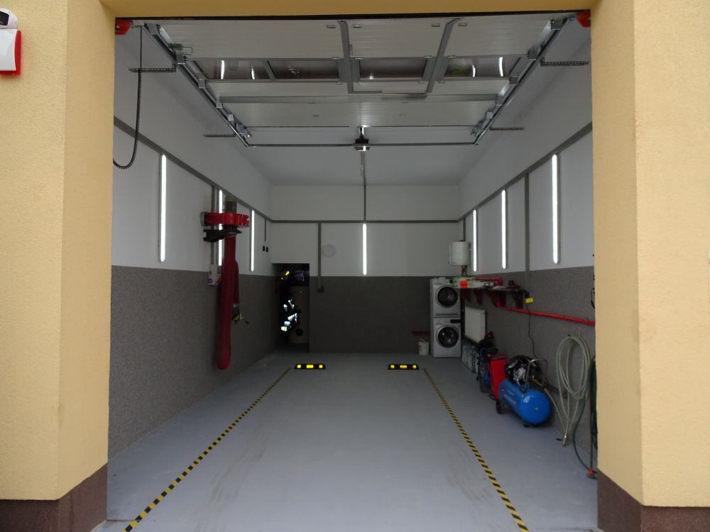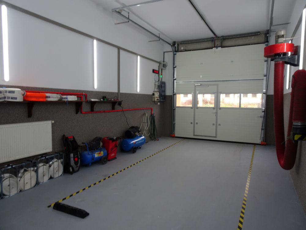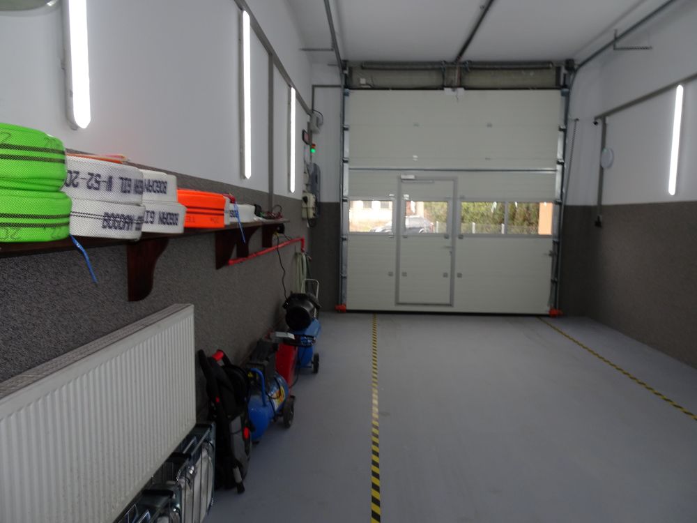 Remont garażu obejmował: wymianę drzwi garażowych na podnoszone automatycznie, prace malarskie, wymianę instalacji elektrycznej oraz montaż zasilania awaryjnego. Ponadto zainstalowano systemy monitoringu oraz alarm antywłamaniowy. Pracę wykonały firmy: Jan Grzeszczuk - Pomiary Ochronne oraz Tadeusz Zaremba - Instal - Bud.